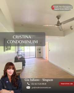 Own or lease a prime property at Cristina Condominium, located in the heart of Legazpi Village, Makati City. Perfect for professionals, expats, or investors looking for a highly accessible and desirable address in the Makati CBD.